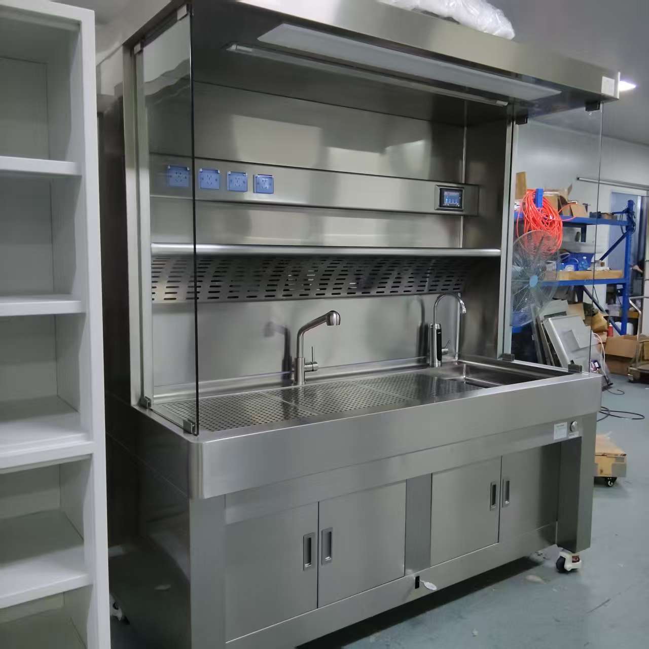 Una campana extractora es típicamente un equipo grande que encierra cinco lados de un área de trabajo, cuya parte inferior se encuentra comúnmente a una altura de trabajo de pie.